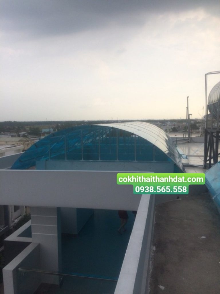 3. Làm mái vòm sân thượng, hàn khung sắt lợp poly lấy sáng khu giếng trời.